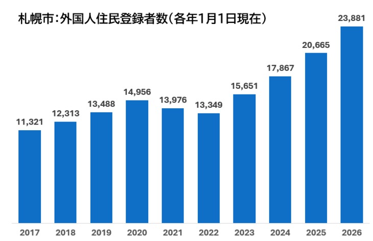 札幌市には2025年1月1日現在20,665人の外国籍市民が在住しており、札幌市の全人口の約1%を占めています。