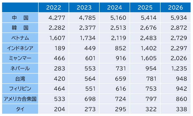 近年はベトナム、ミャンマー、インドネシア国籍の人口が急激に伸びています。