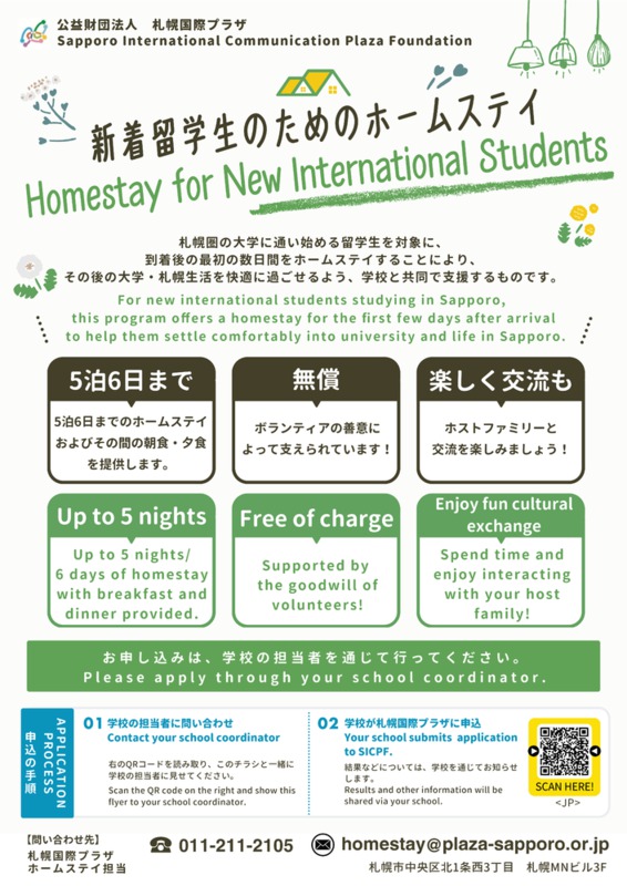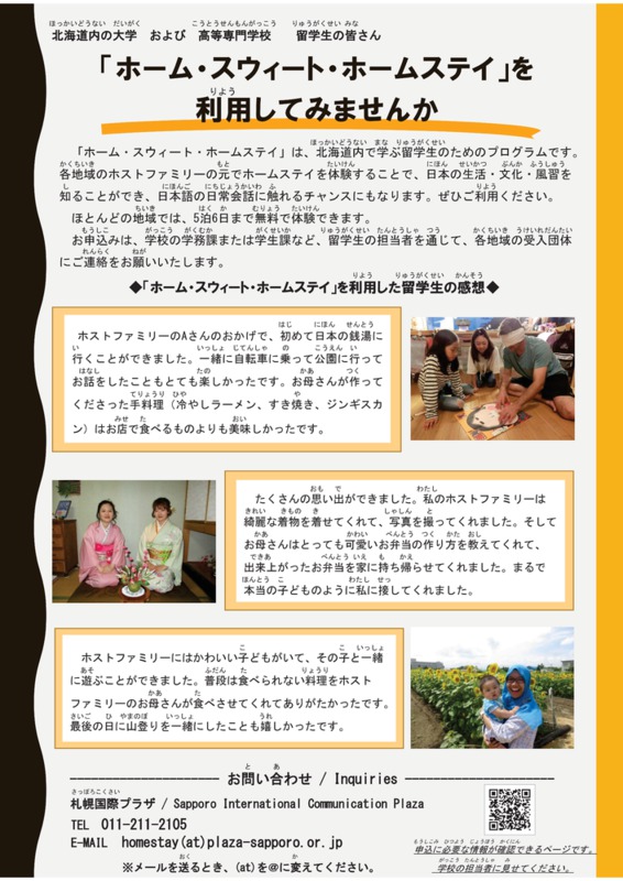 E-MAIL: homestay(at)plaza-sapporo.or.jp ※when sending an email, please replace “(at)” with “@”.